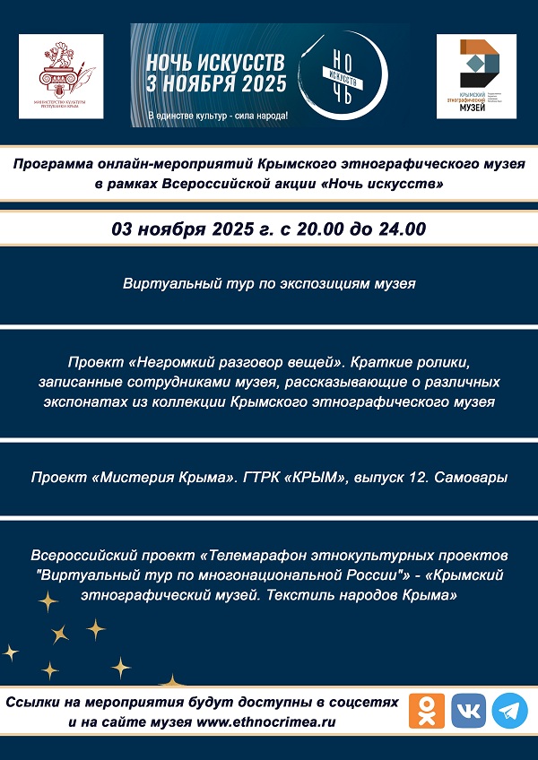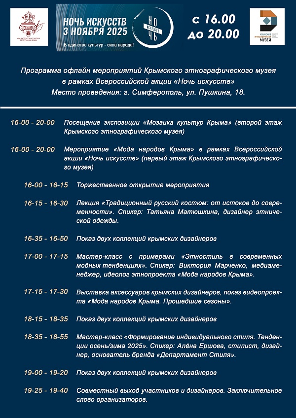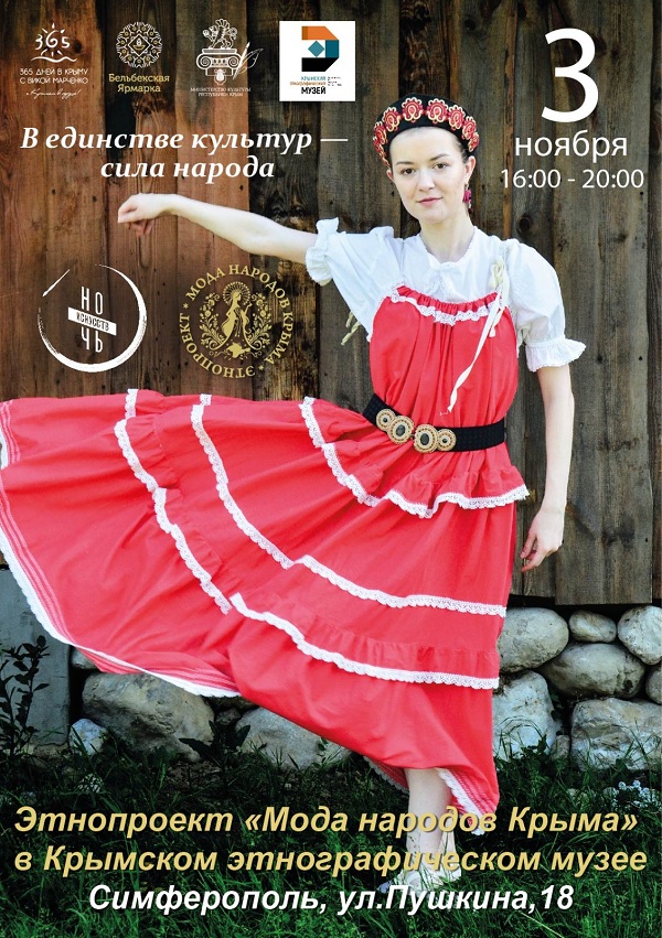 16-00 – 20-00 - мероприятие "Мода народов Крыма» в рамках Всероссийской акции «Ночь искусств" (первый этаж Крымского этнографического музея)