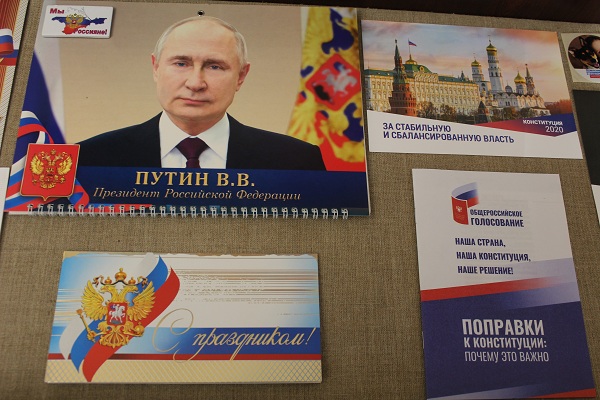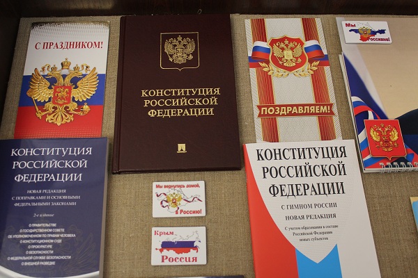 Вниманию посетителей выставки представлены печатные издания 2023 года - Конституция Российской Федерации с Гимном России в новой редакции с учетом образования в составе Российской Федерации новых субъектов и Конституция Российской Федерации в новой редакции с поправками и основными Федеральными законами (2-е издание), подарочное издание Конституции Российской Федерации (с гимном) 2025 года, раздаточные буклеты и рекламные листовки о голосовании за поправки в Конституцию 2020 года, поздравительные открытки, сувенирная продукция, информационные плакаты с государственной символикой и атрибутами праздника.