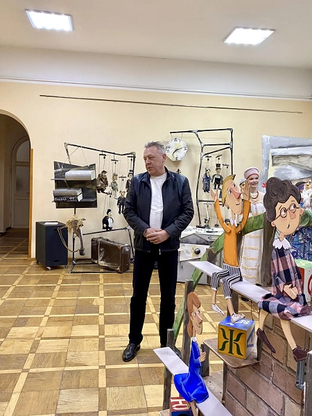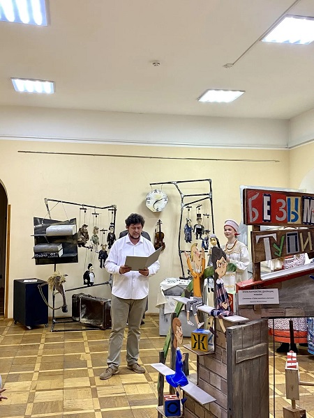 Режиссёр театра Дмитрий Константинович Смирнов зачитал адрес от председателя Крымского отделения Союза театральных деятелей России Павла Анатольевича Косова и рассказал об экспонатах выставки.