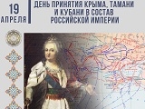19 апреля (8 апреля по старому стилю) 1783 года императрица Екатерина II подписала высочайший манифест «О принятии Крымского полуострова, острова Тамани и всея Кубанской стороны под державу Российскую». Федеральным законом №336-ФЗ от 3 августа 2018 года День принятия Крыма, Тамани и Кубани в состав Российской империи 19 аперля установлено как памятная дата России.